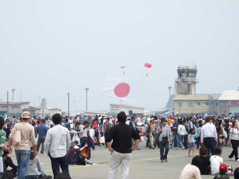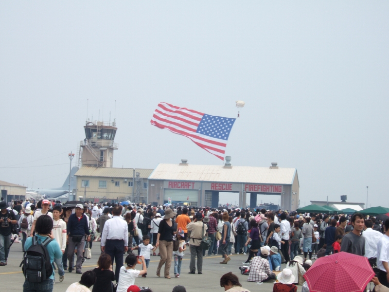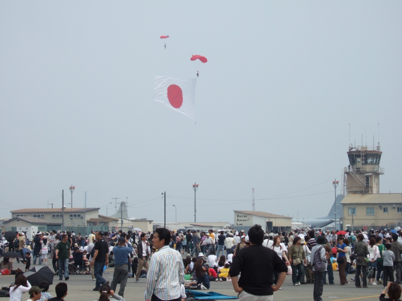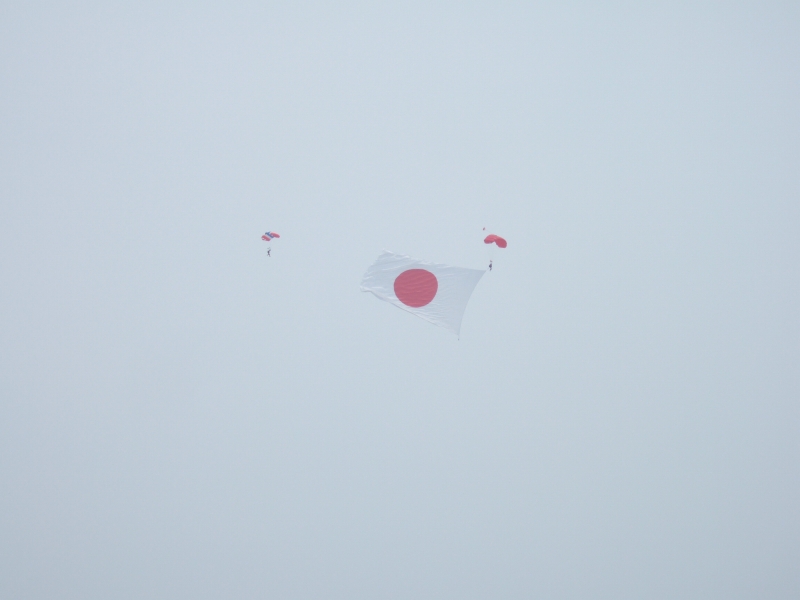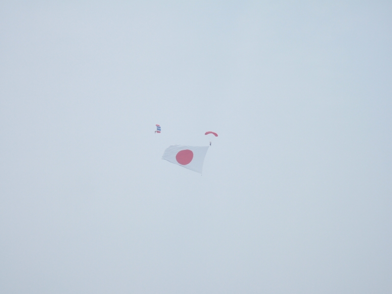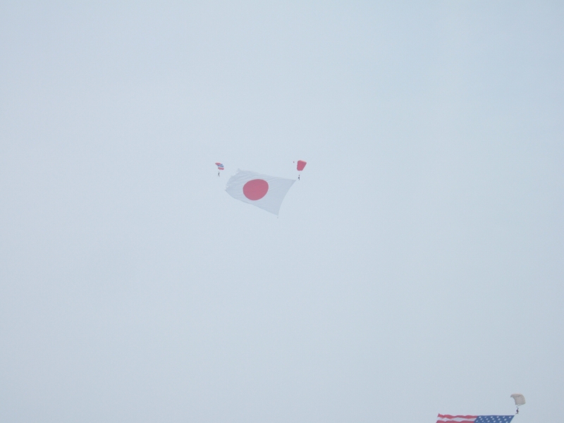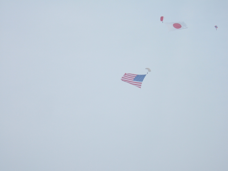 パラシュートで日本とアメリカの巨大な国旗を持った2人のスカイジャンパーが飛び降りていました。