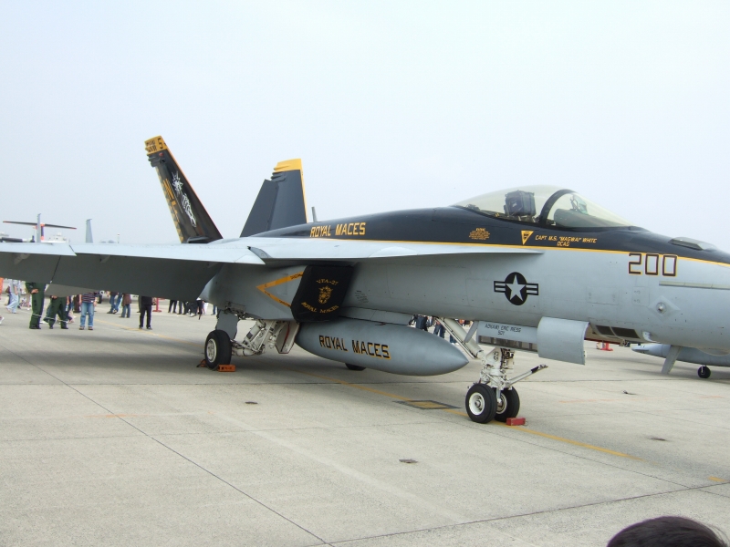 F-18Eスーパーホーネット。VFA-27ロイヤルメイセスの機体。しかし真正面からの姿はすばらしい。